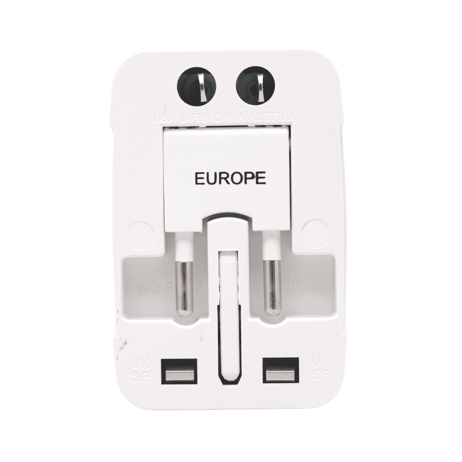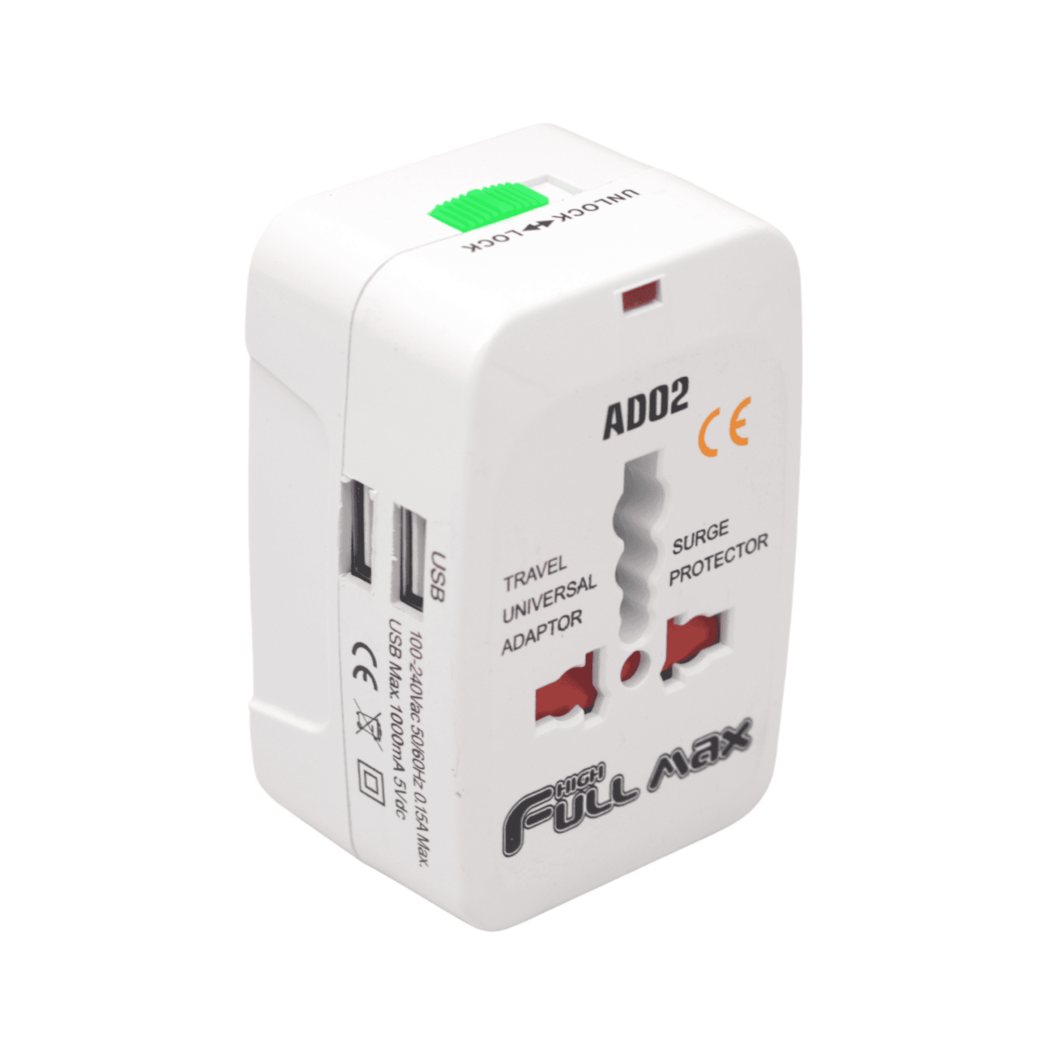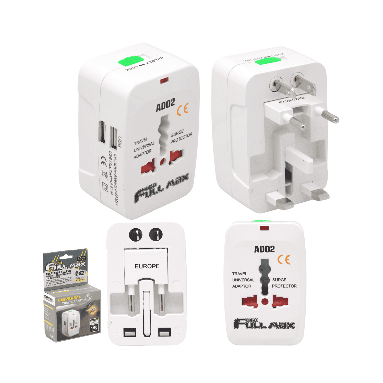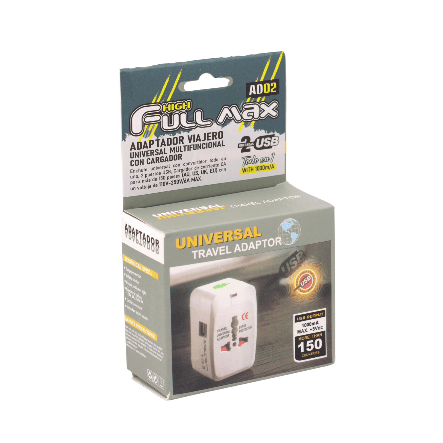 Compatible con enchufes internacionales (US/EU/UK/AU), incluye 2 puertos USB integrados para cargar smartphones, tablets u otros dispositivos sin necesidad de accesorios adicionales. Su fusible de seguridad protege contra sobrecargas y fluctuaciones de voltaje, mientras que el indicador LED confirma el funcionamiento correcto.