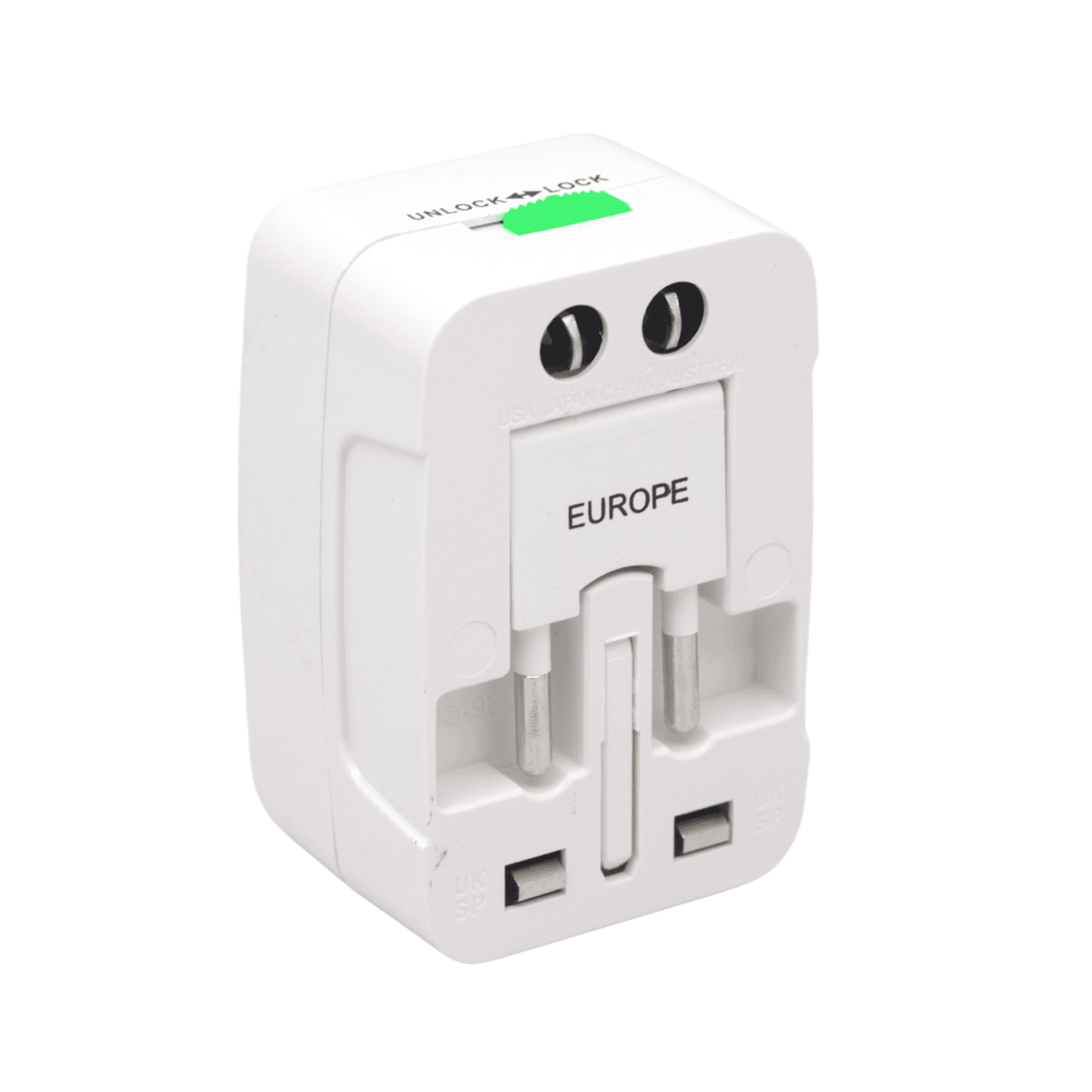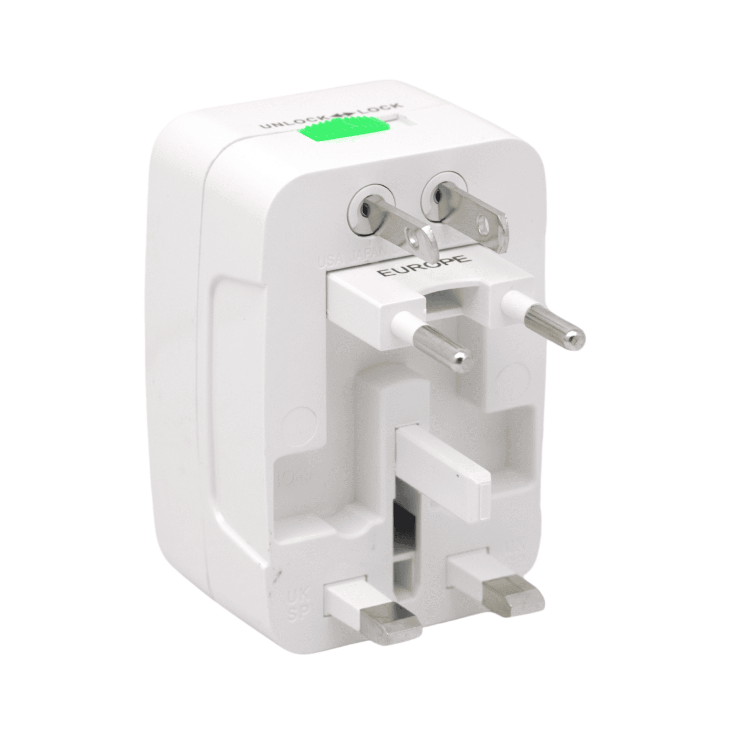 Adaptador universal con conexión a tierra, diseñado especialmente para viajeros que necesitan una solución práctica y confiable para cargar sus dispositivos en cualquier lugar del mundo.