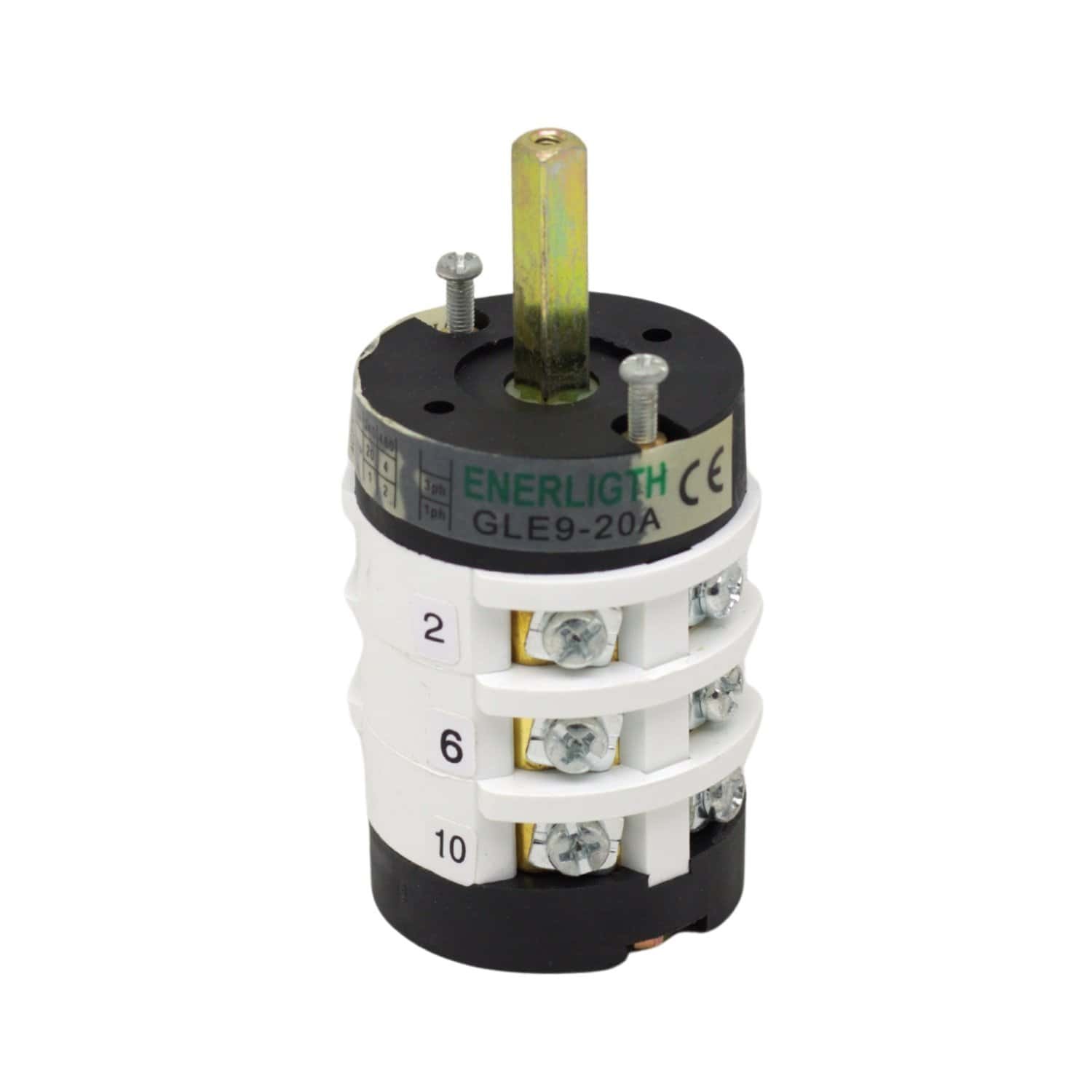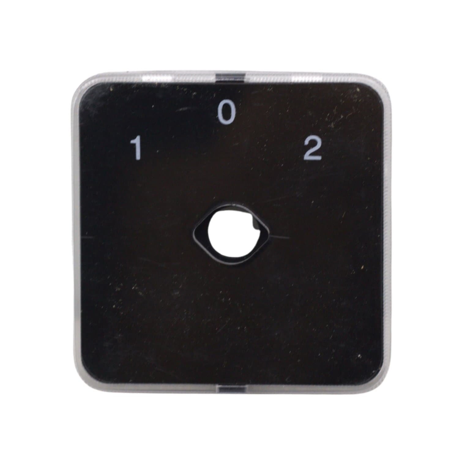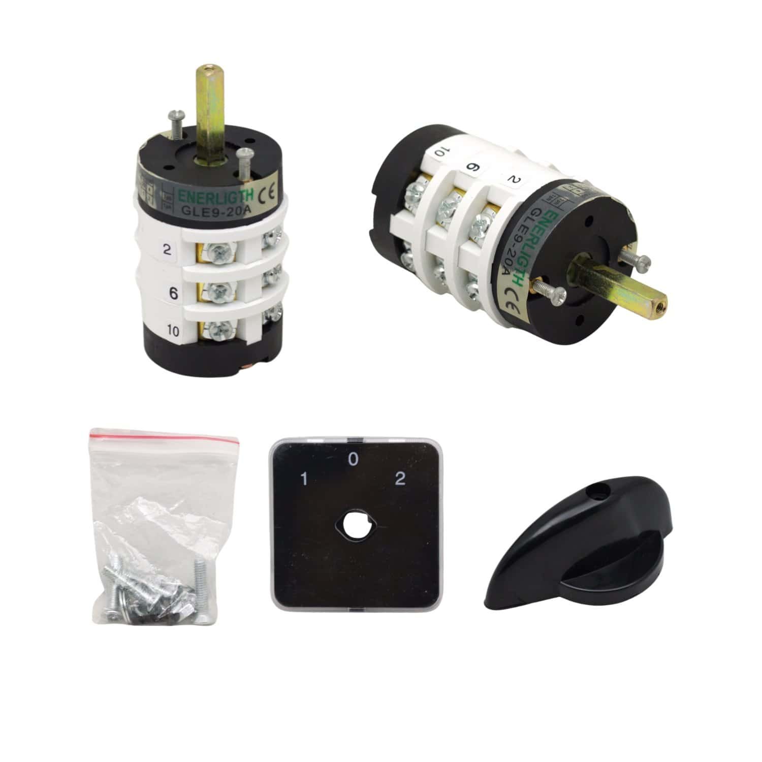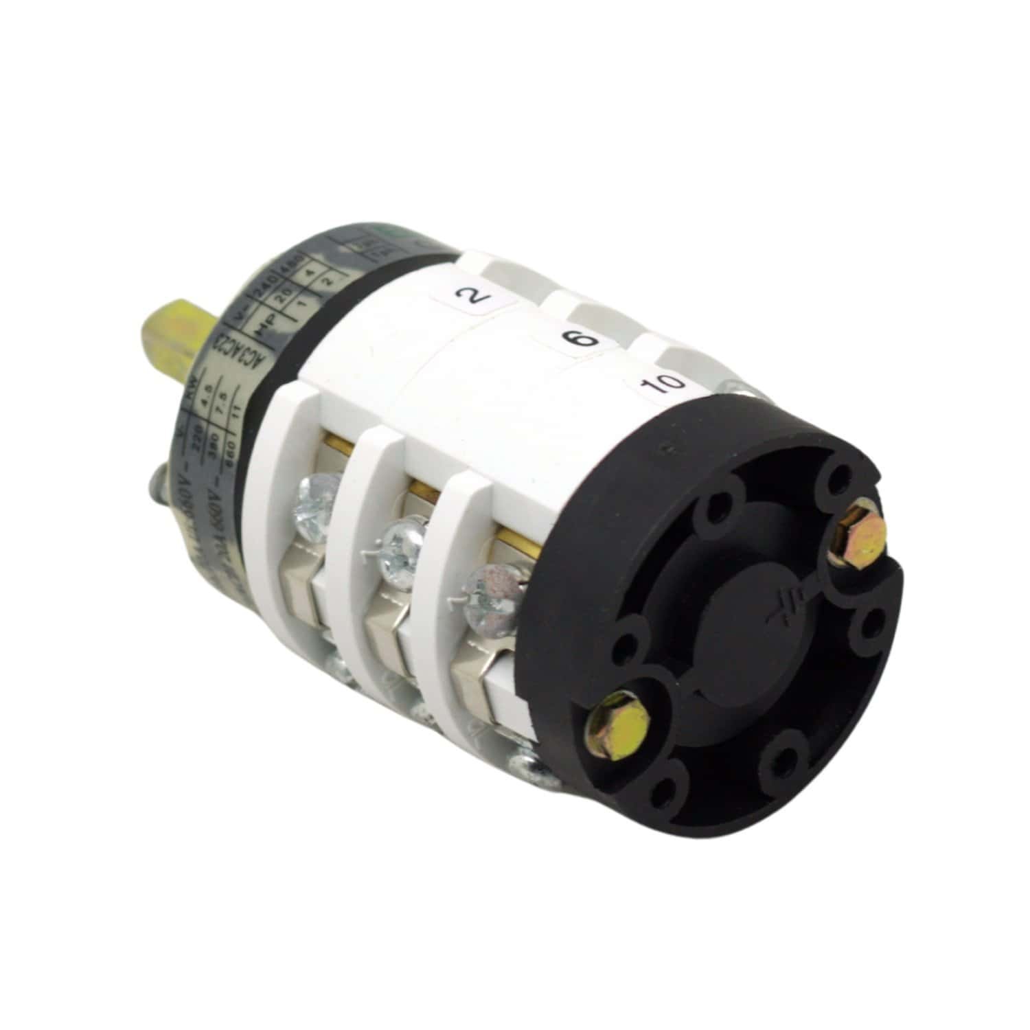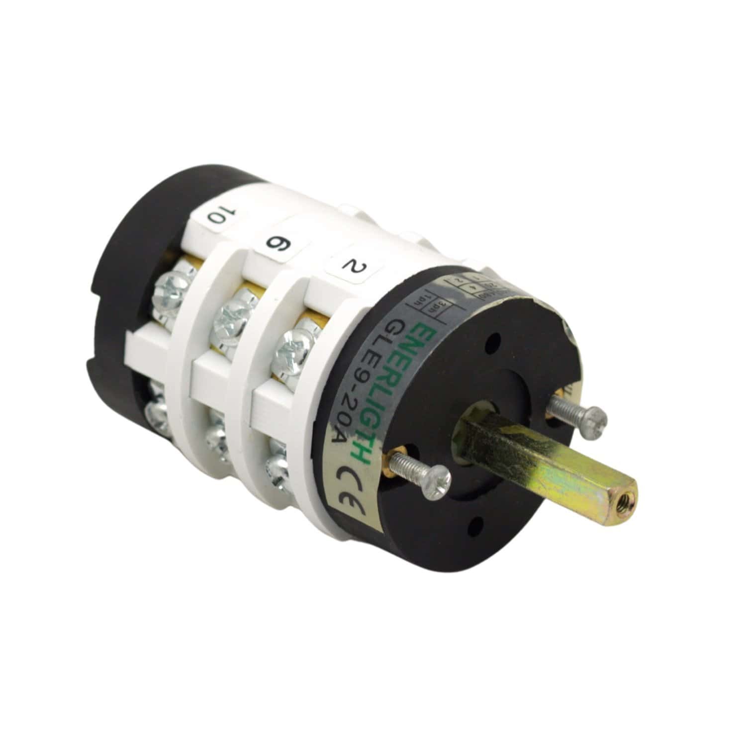 Conmutador rotativo de 3 posiciones (1-0-2) con capacidad de 20A, diseñado para la conmutación manual entre dos líneas de alimentación o corte total del circuito.