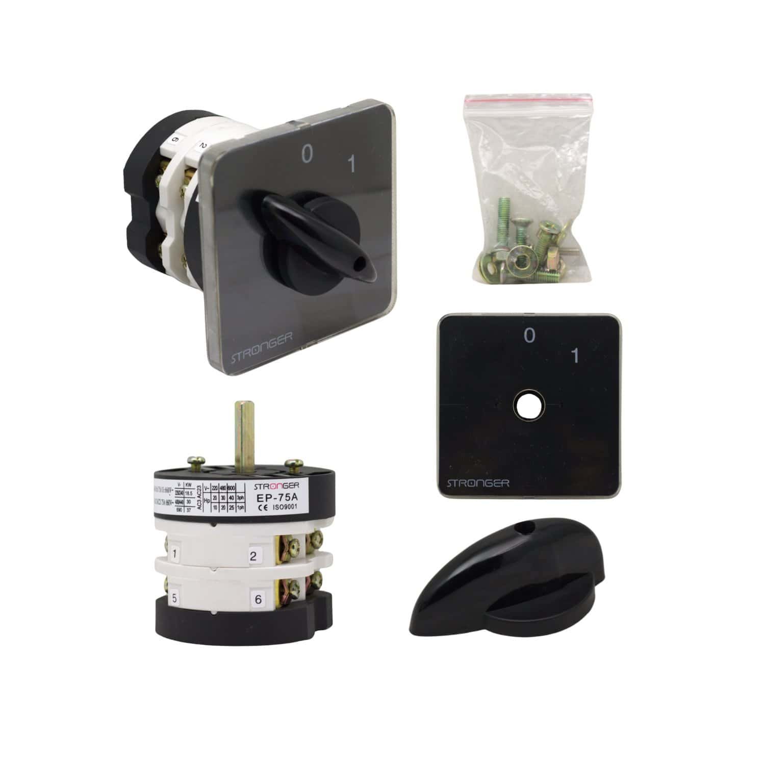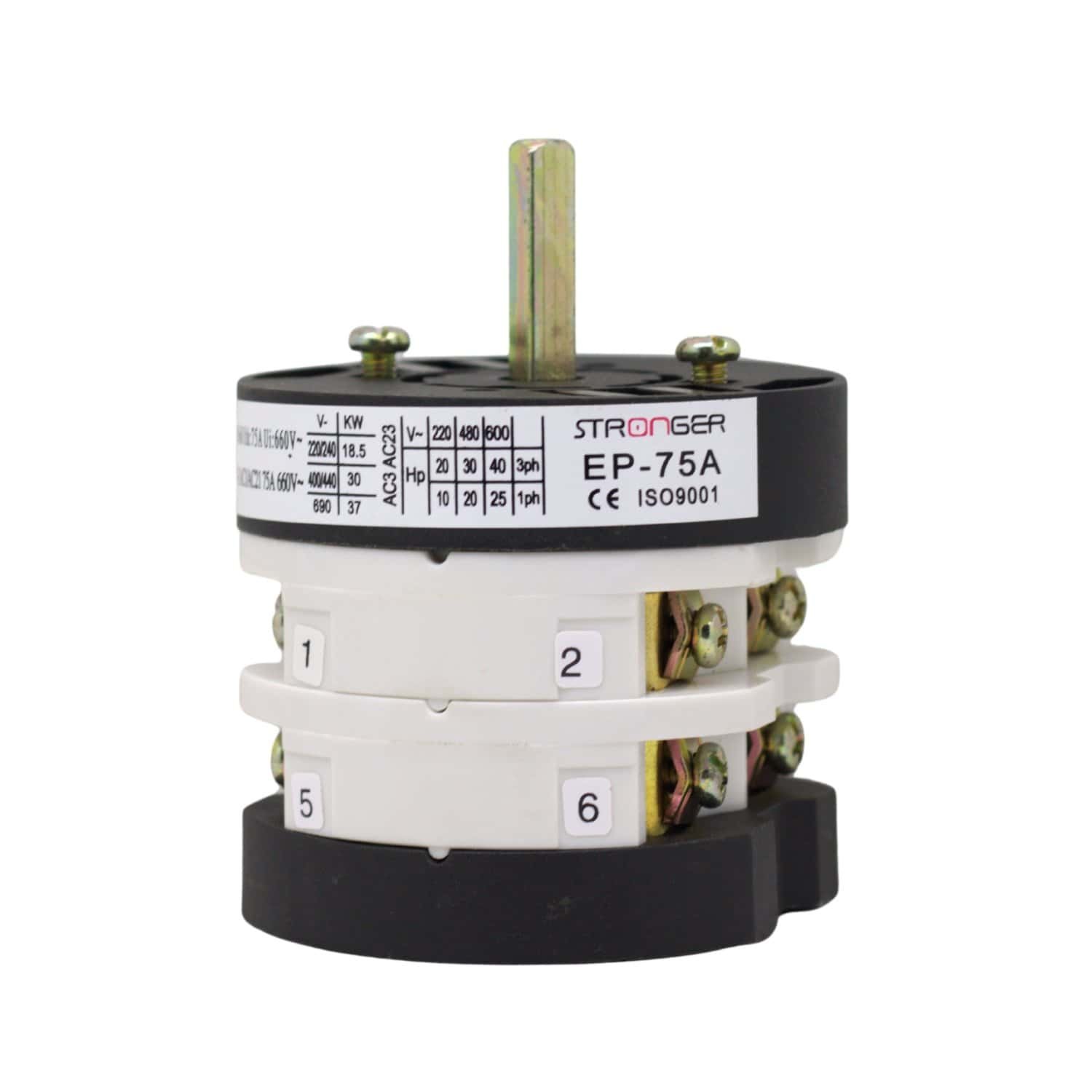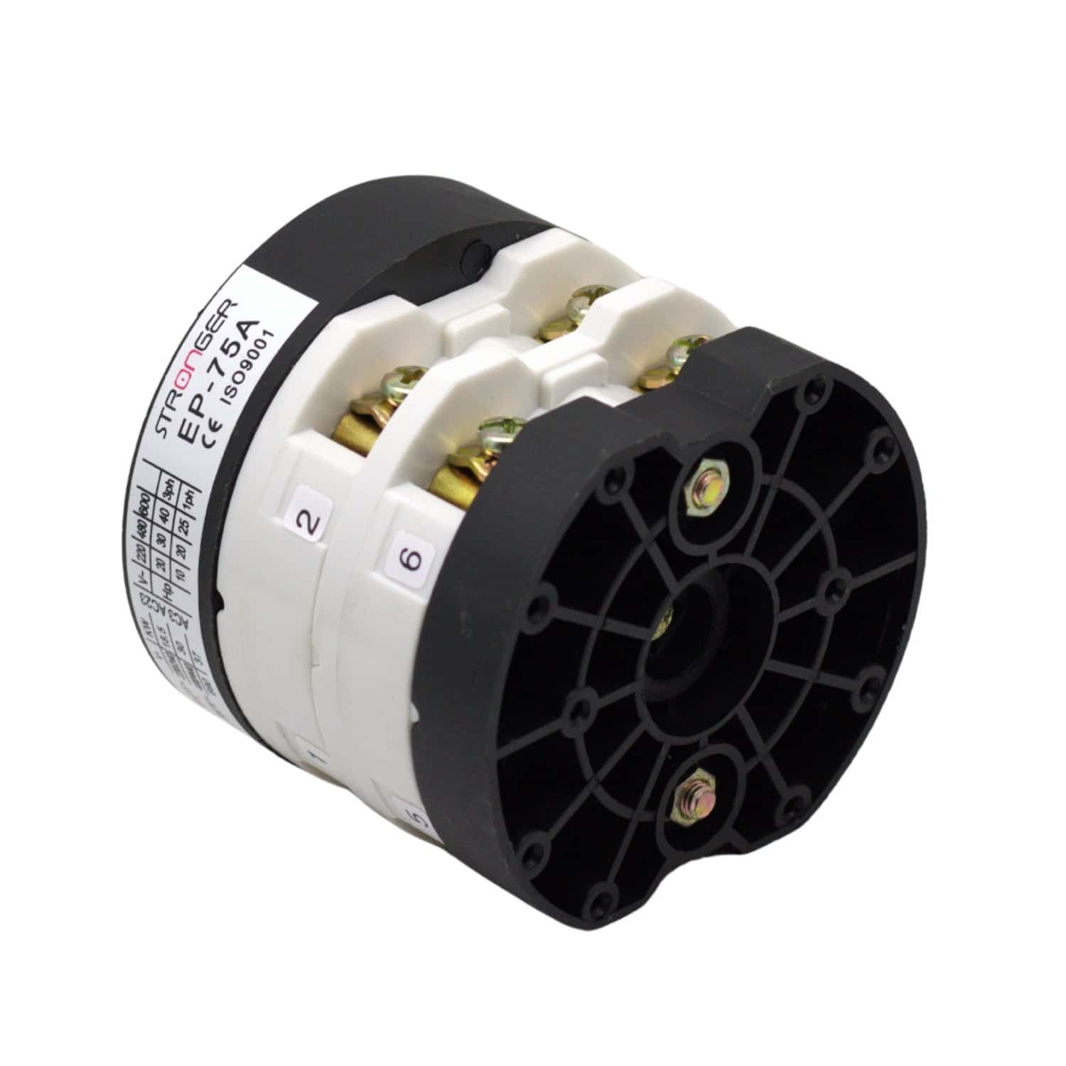 Conmutador rotativo tipo ON-OFF con capacidad de 75A, diseñado para la conexión y desconexión manual de circuitos eléctricos.