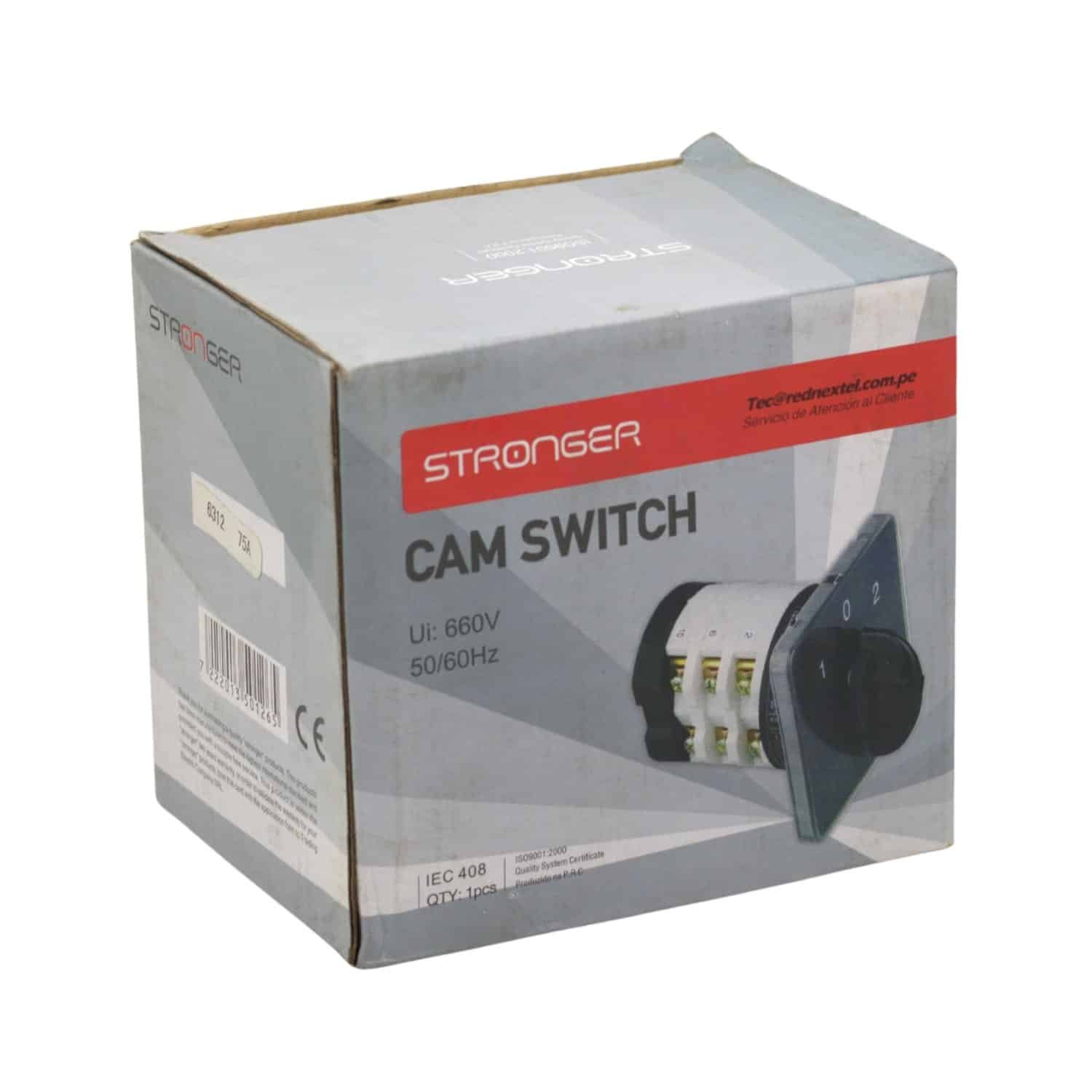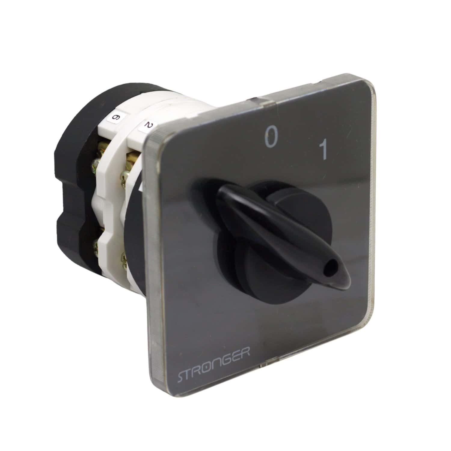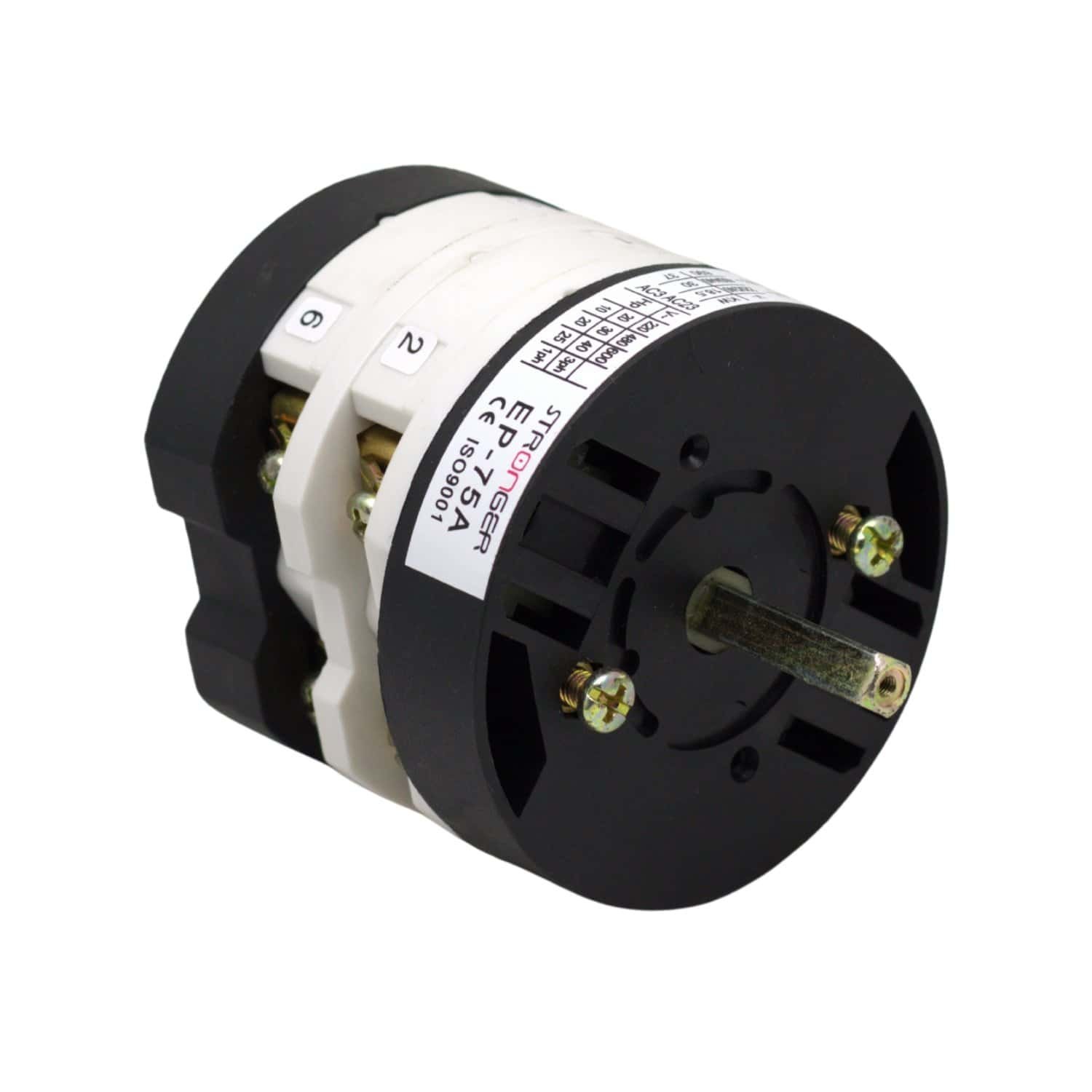 Conmutador rotativo tipo ON-OFF con capacidad de 75A, diseñado para la conexión y desconexión manual de circuitos eléctricos.