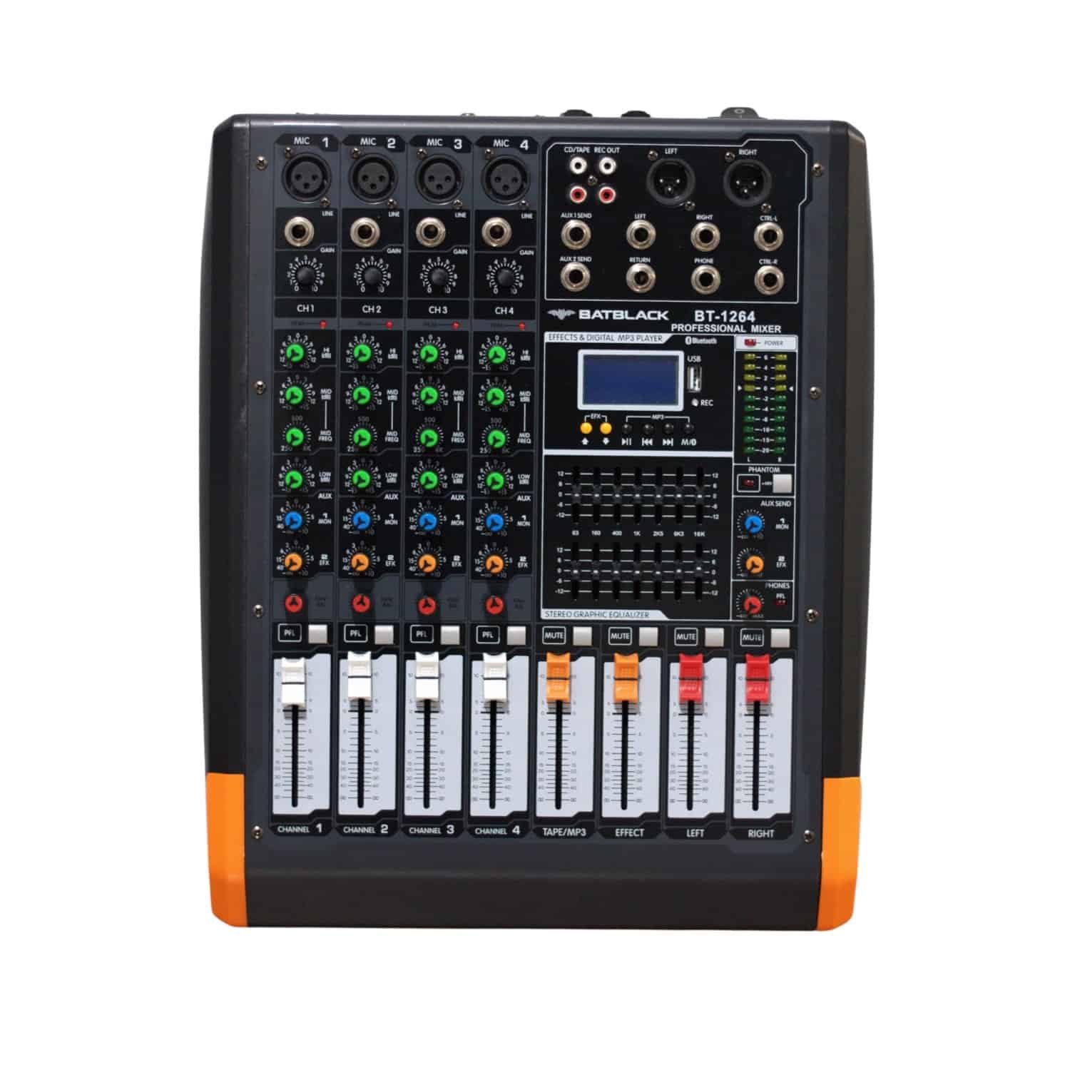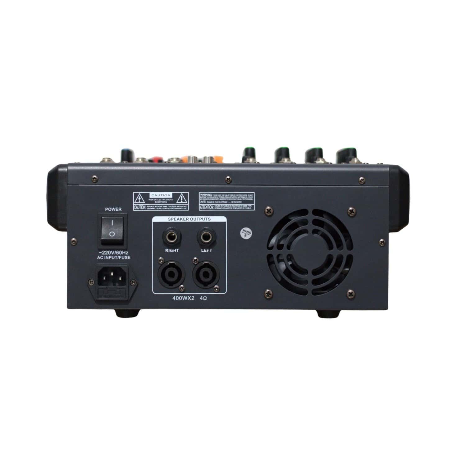 Cuenta con alimentación Phantom +48V para micrófonos de condensador, ecualización por canal (2–3 bandas según versión) y ecualizador gráfico master de 5 o 7 bandas. Incorpora procesador DSP con efectos digitales como Reverb y Echo.