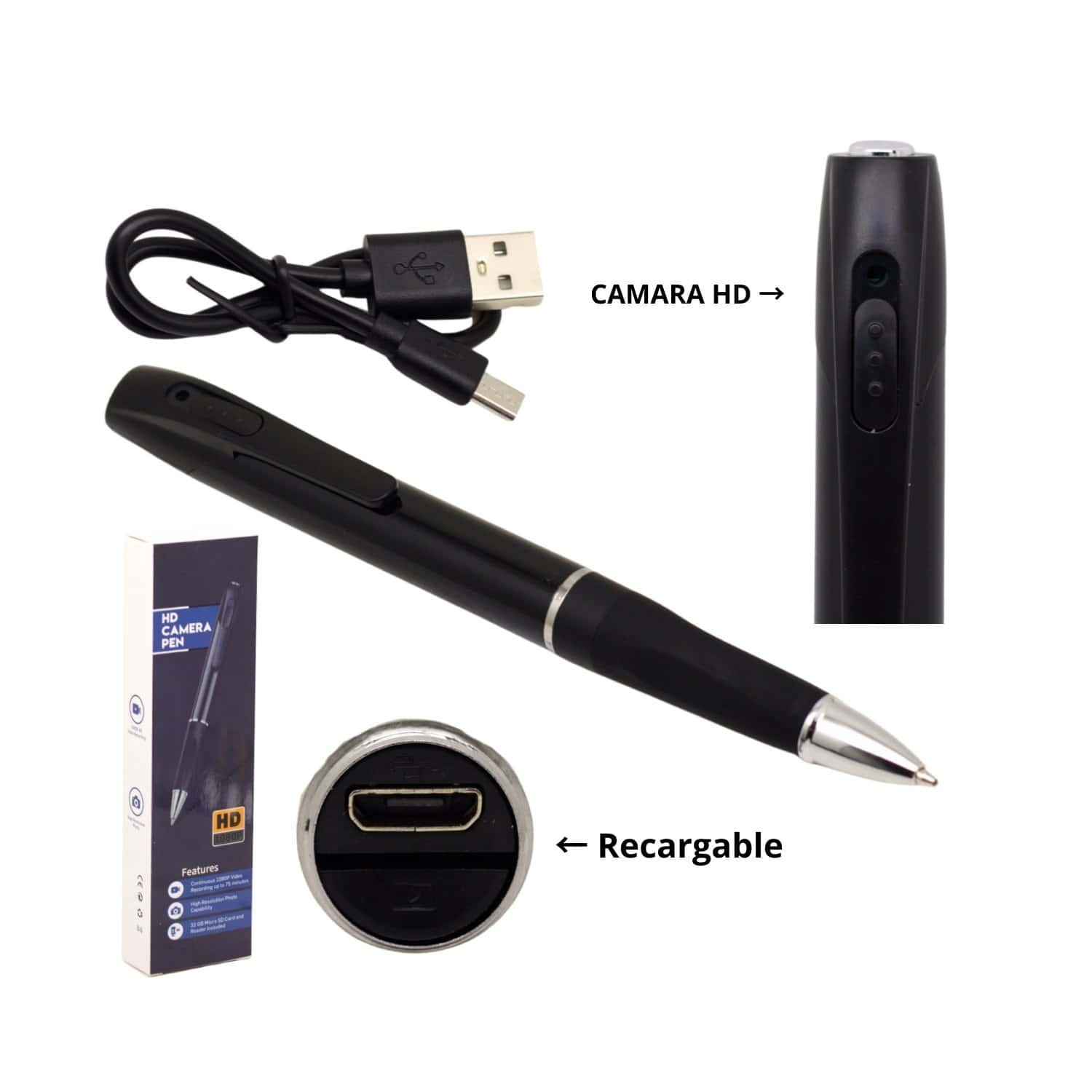 Cuenta con batería interna recargable de 280 mAh, que brinda hasta 1 hora de grabación continua, y soporta tarjetas microSD de hasta 32 GB. Se carga fácilmente por USB 5V, ya sea desde PC, laptop, TV o adaptador de corriente. Además de grabar, funciona perfectamente como lapicero tradicional, lo que lo hace práctico y funcional.