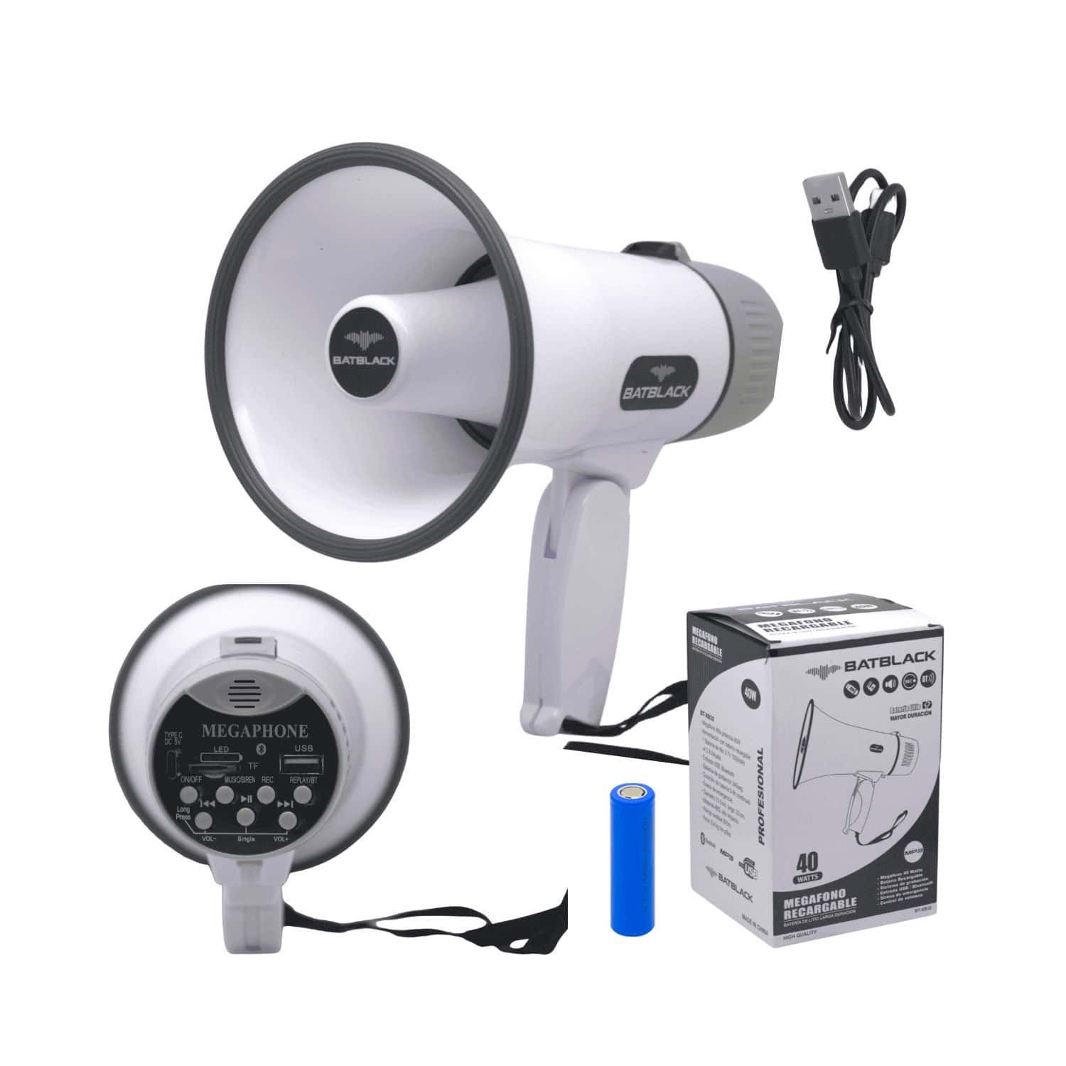 Megafono ideal para comunicarte con fuerza y claridad en cualquier entorno. Con sus 40W de potencia, ofrece un alcance de hasta 500 metros, perfecto para eventos, anuncios, actividades deportivas o situaciones de seguridad. Funciona con batería recargable de litio de 3.7V (opcionalmente funciona con 3 pilas AA), brindando entre 5 y 8 horas de uso continuo. Su conectividad Bluetooth y entrada USB permiten reproducir música o mensajes grabados, mientras que el sistema de grabación integrado (240 segundos) facilita repetir anuncios fácilmente. Además, incorpora una sirena de emergencia y está fabricado en ABS de alto impacto, garantizando resistencia y ligereza.