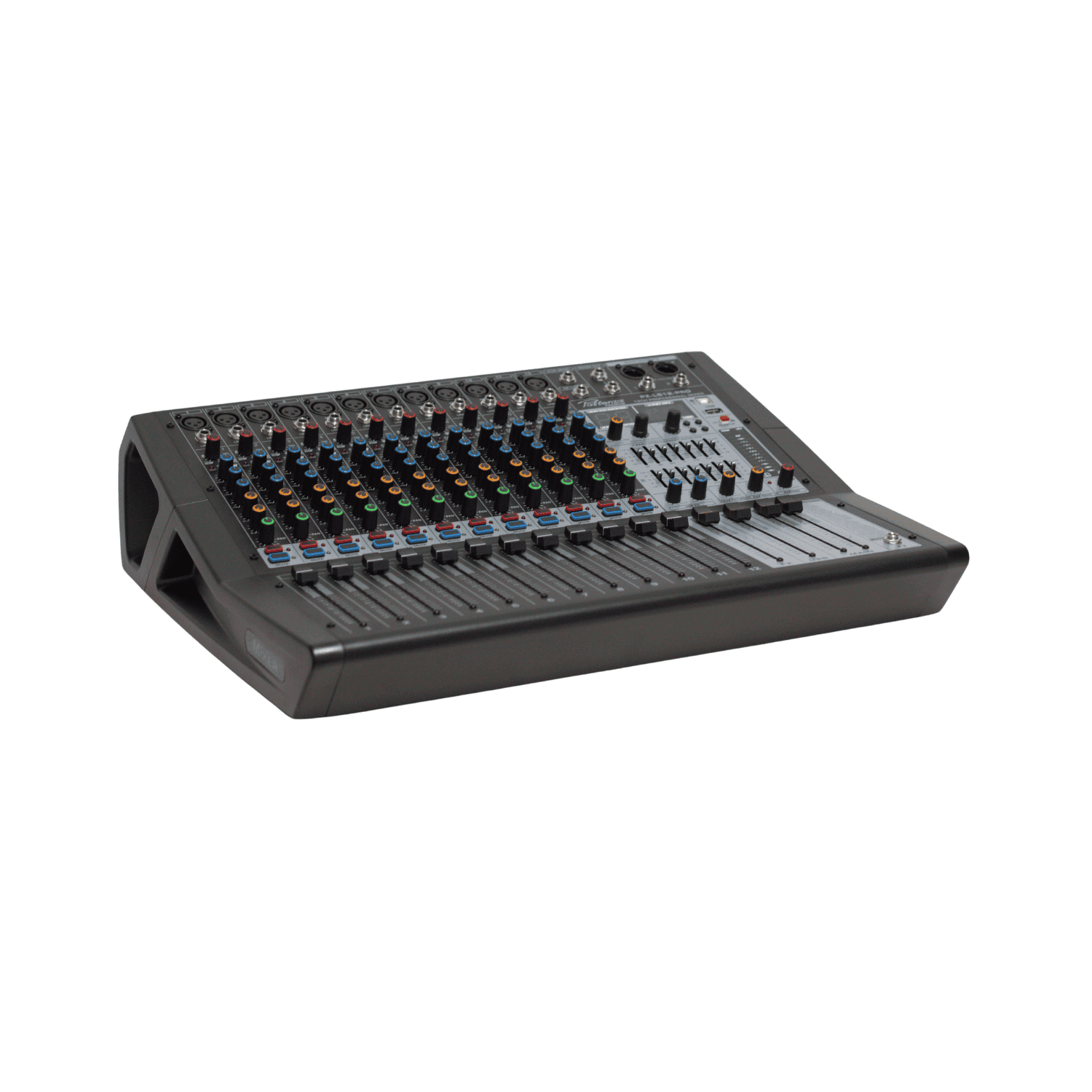Consola de audio amplificada profesional de 12 canales, diseñada para ofrecer potencia y versatilidad en un solo equipo.