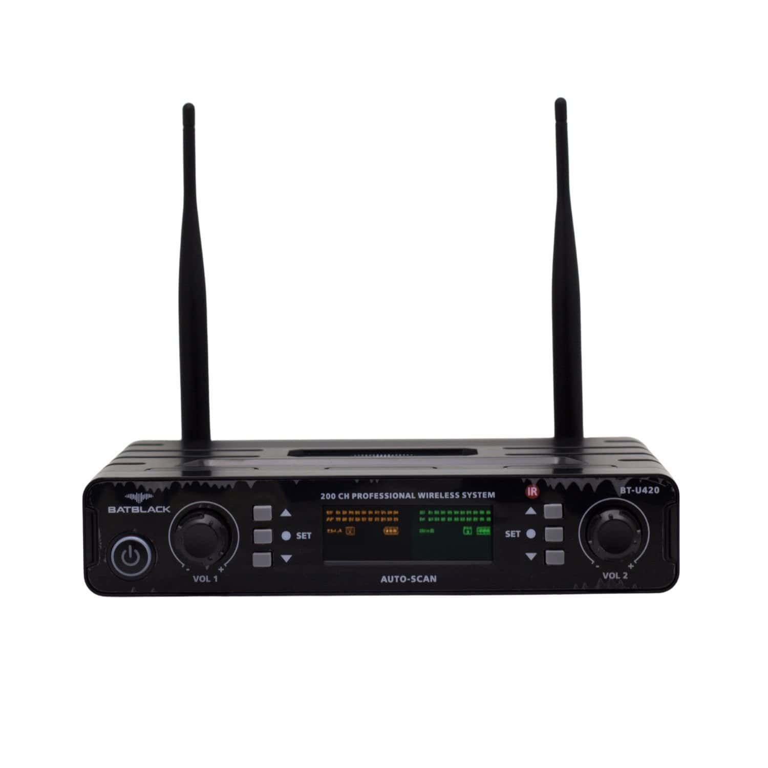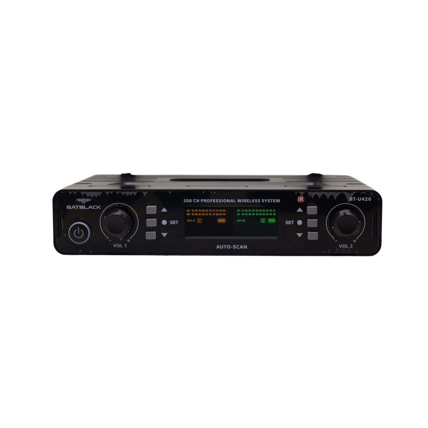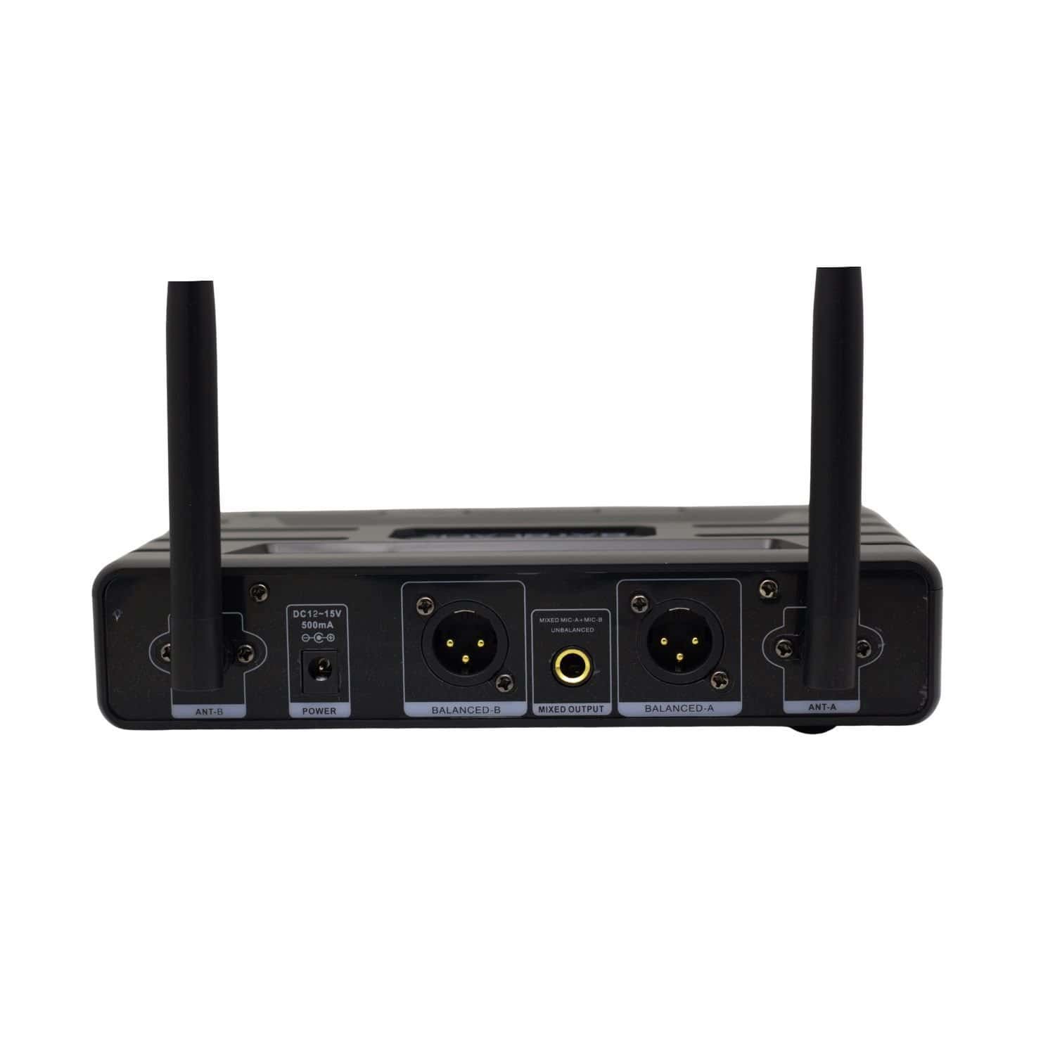Su receptor opera con fuente DC12–15V o AC100–240V, e incluye pantalla digital y salidas XLR balanceadas y plug 6.35 mm.