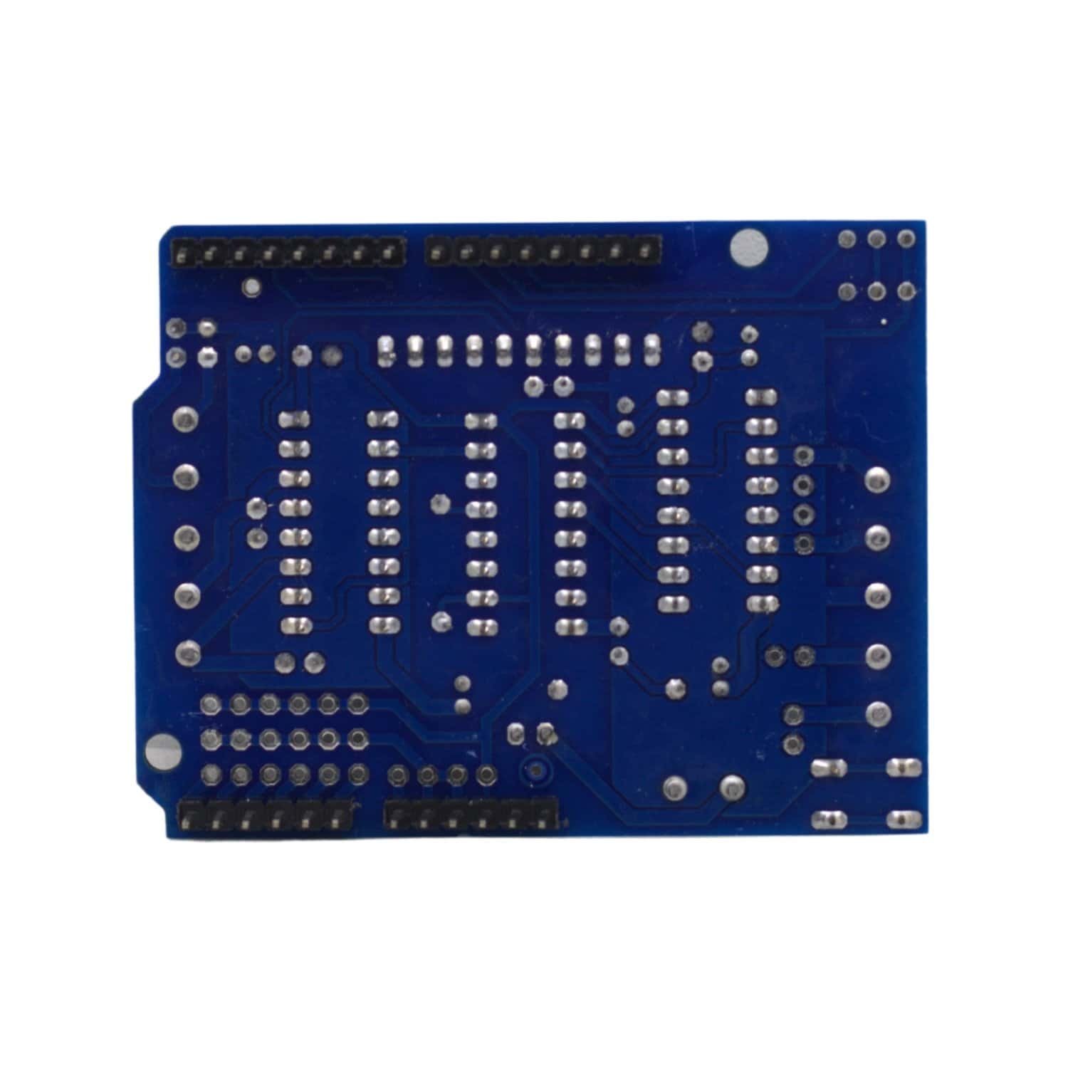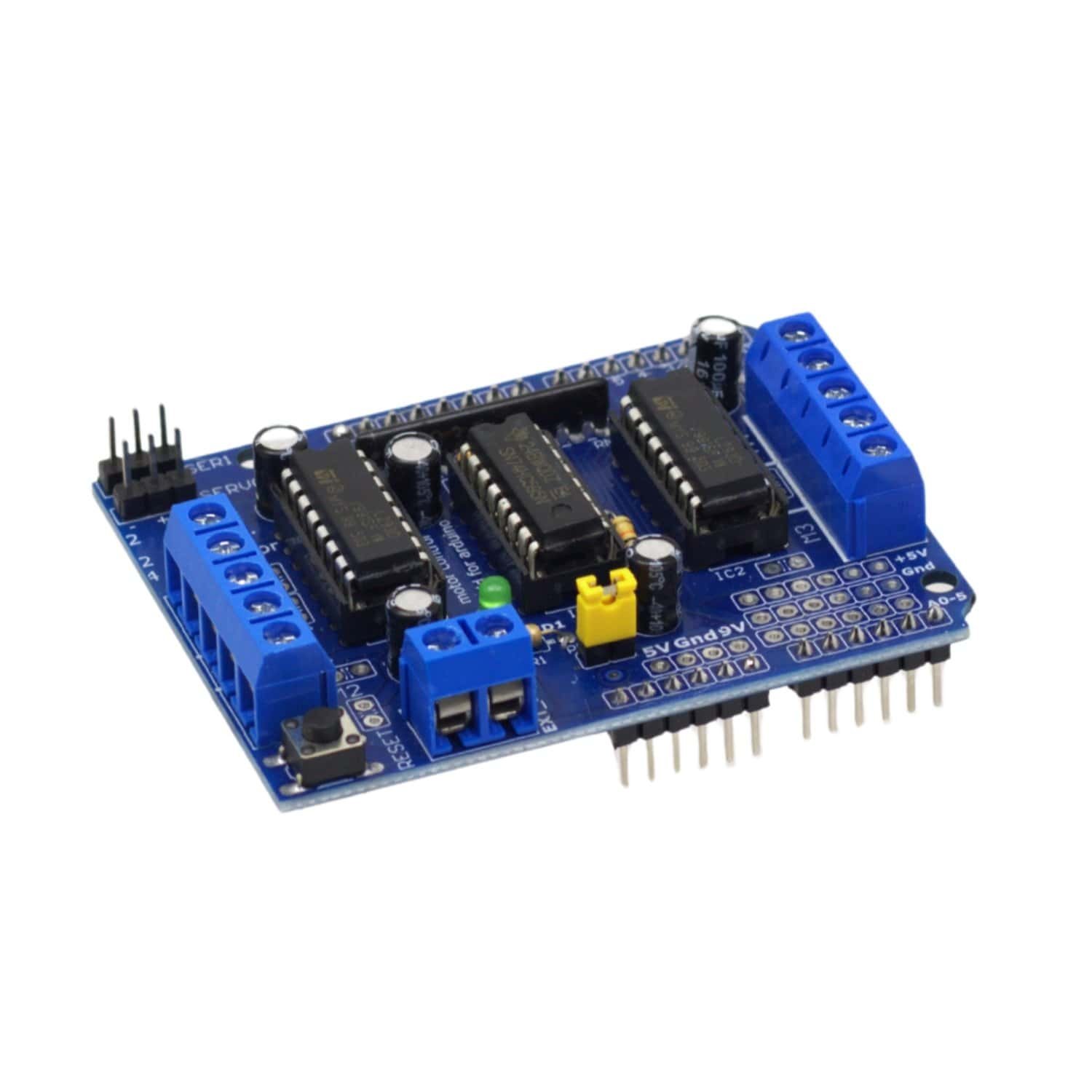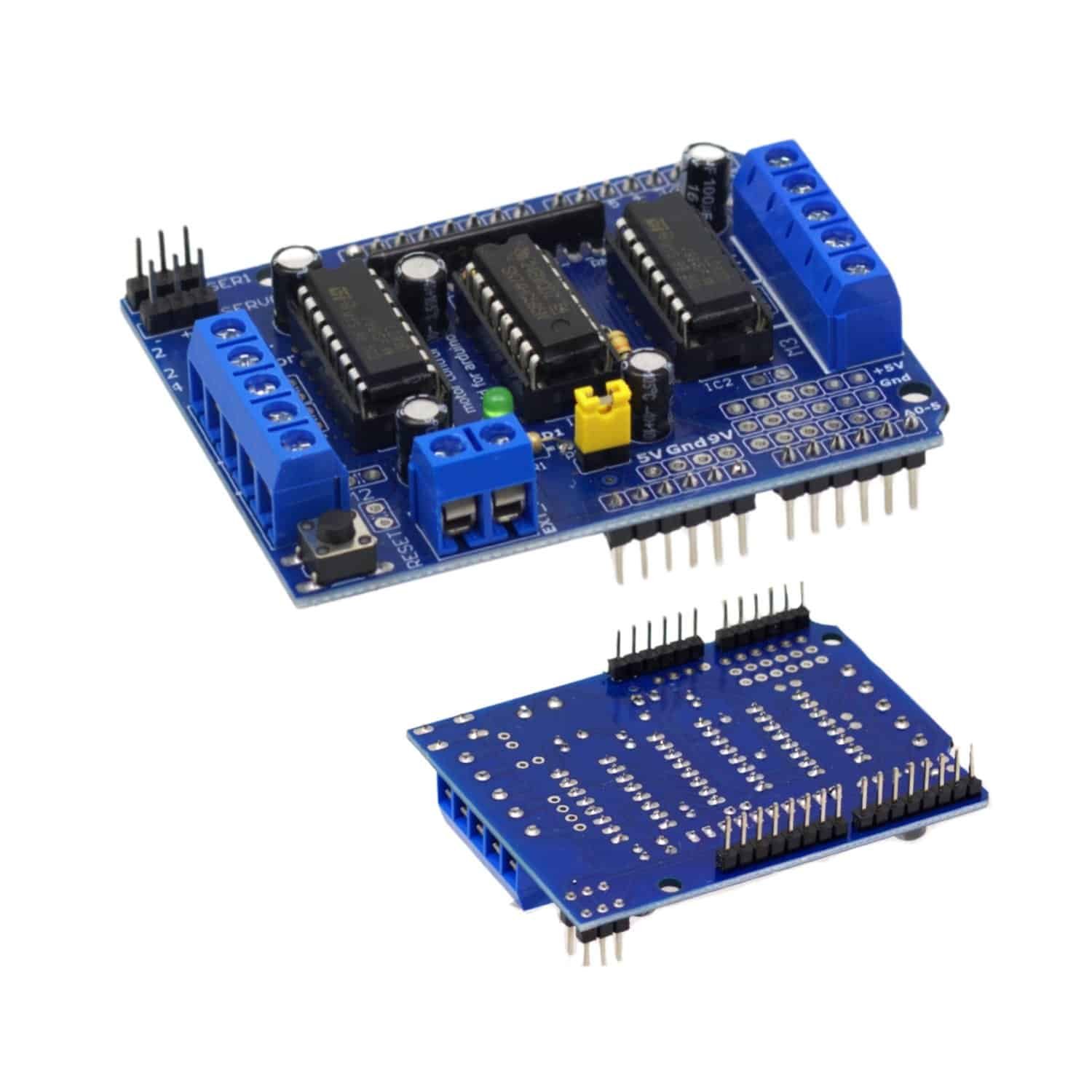 Este shield incorpora dos circuitos integrados L293D que proporcionan 4 puentes H completos, permitiendo controlar hasta 4 motores DC bidireccionales o 2 motores paso a paso (unipolares o bipolares).