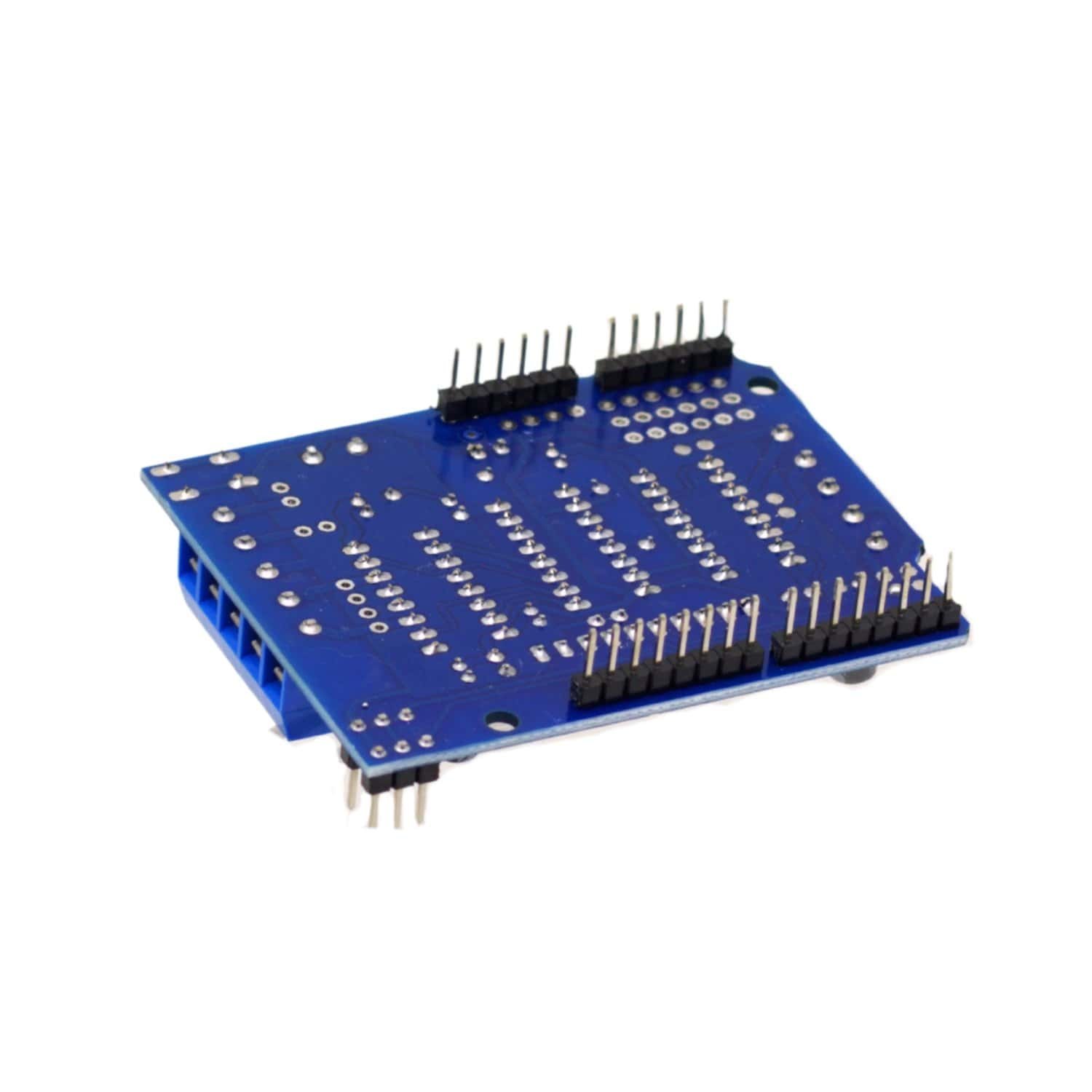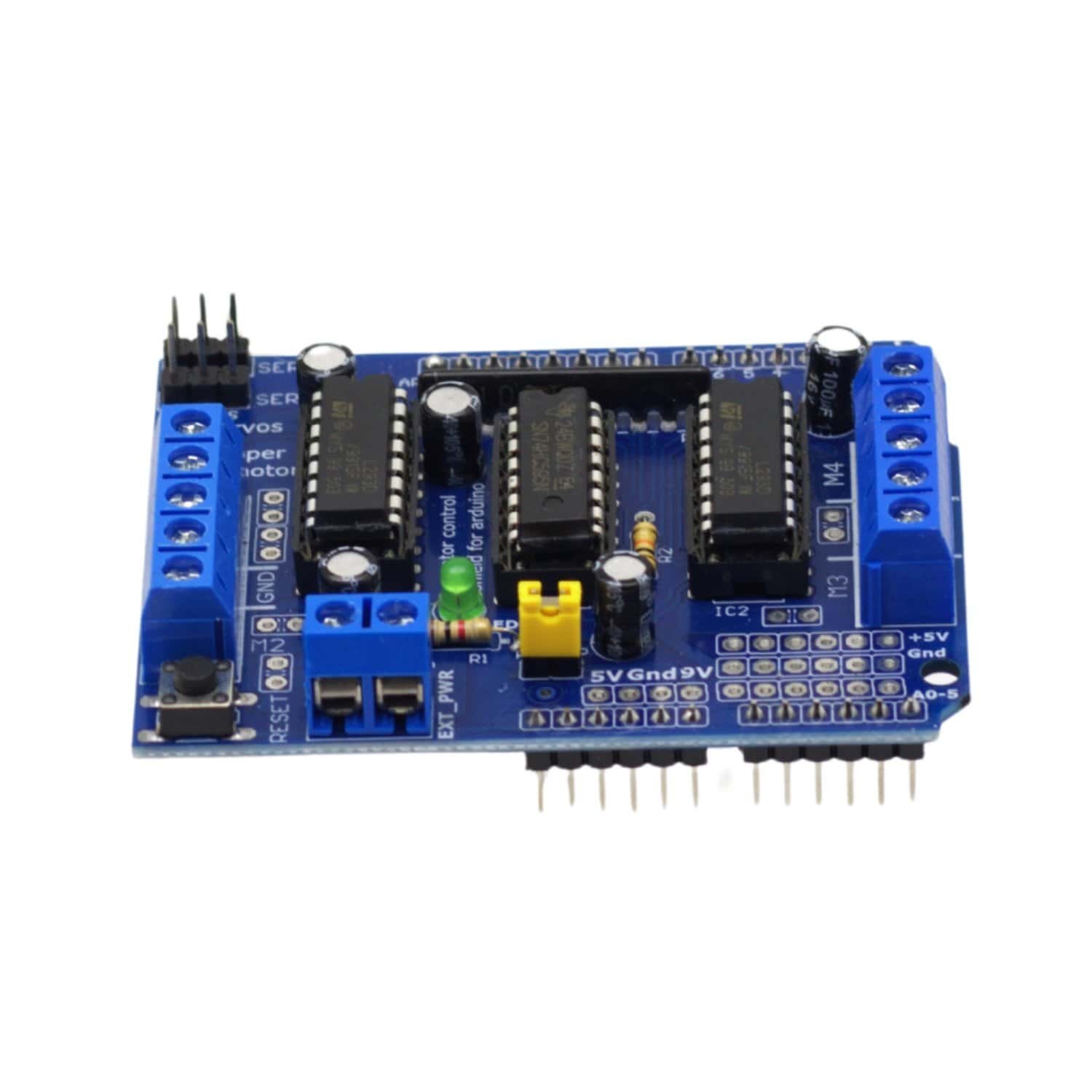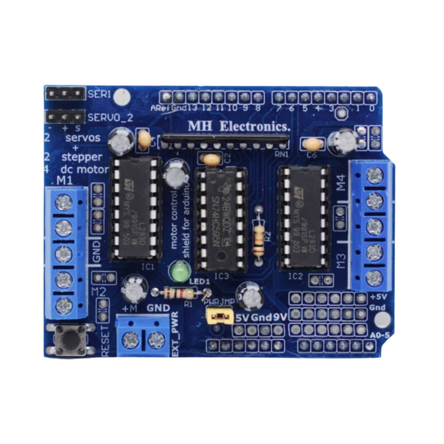Este shield incorpora dos circuitos integrados L293D que proporcionan 4 puentes H completos, permitiendo controlar hasta 4 motores DC bidireccionales o 2 motores paso a paso (unipolares o bipolares).