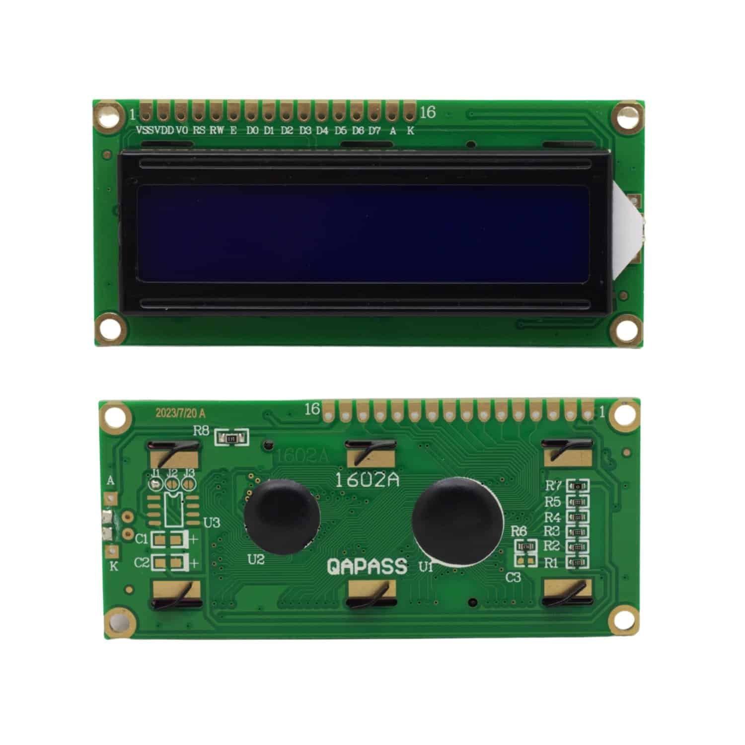 Esta pantalla LCD ofrece un formato de 16 caracteres por 2 líneas, permitiendo mostrar información de manera legible. Es totalmente compatible con el controlador Hitachi HD44780, lo que garantiza su funcionamiento con la librería LiquidCrystal en Arduino y otros microcontroladores.
