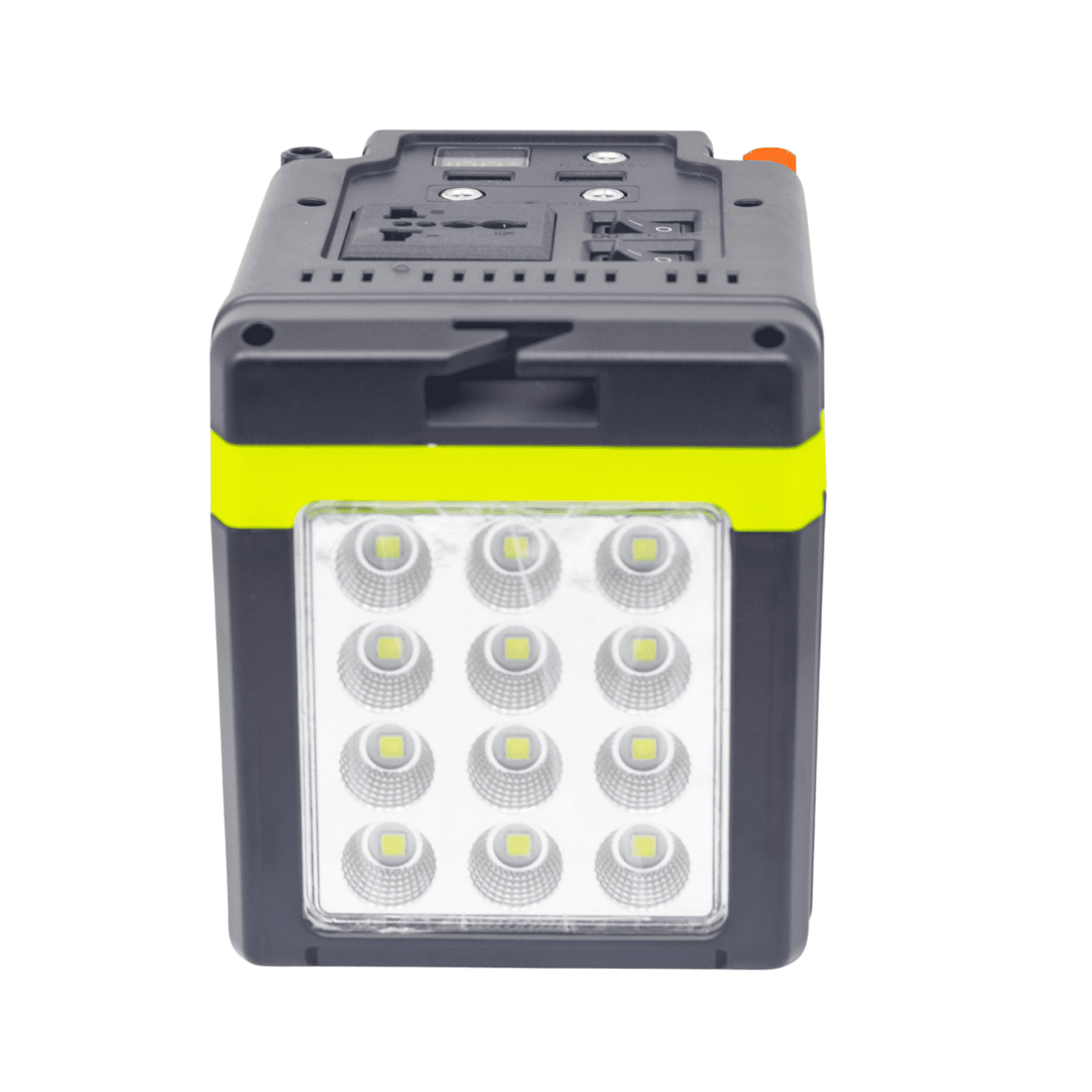 Sistema portátil de energía solar, tiene una potencia de 200w, junto a una batería extraíble, focos LED y múltiples puertos de conexión. Tambien incluye una Lampara lateral y linterna LED, perfecta para multiples situaciones.
