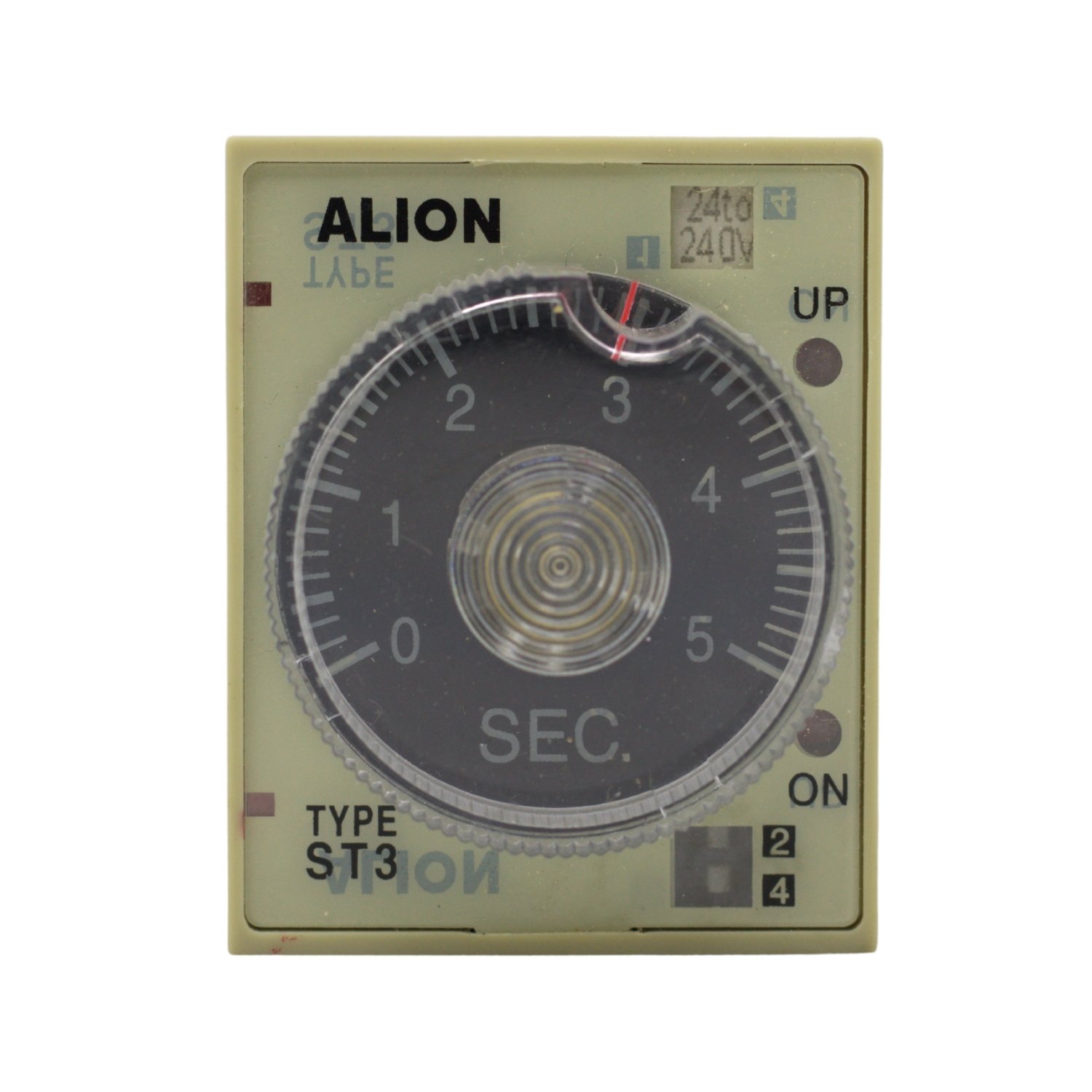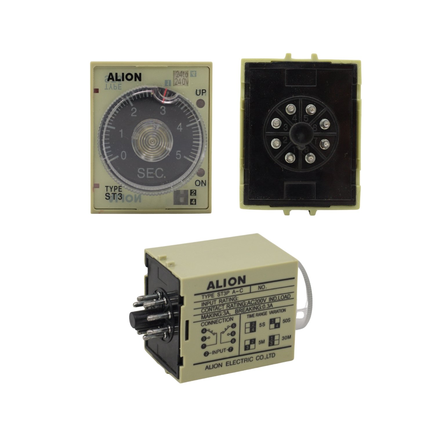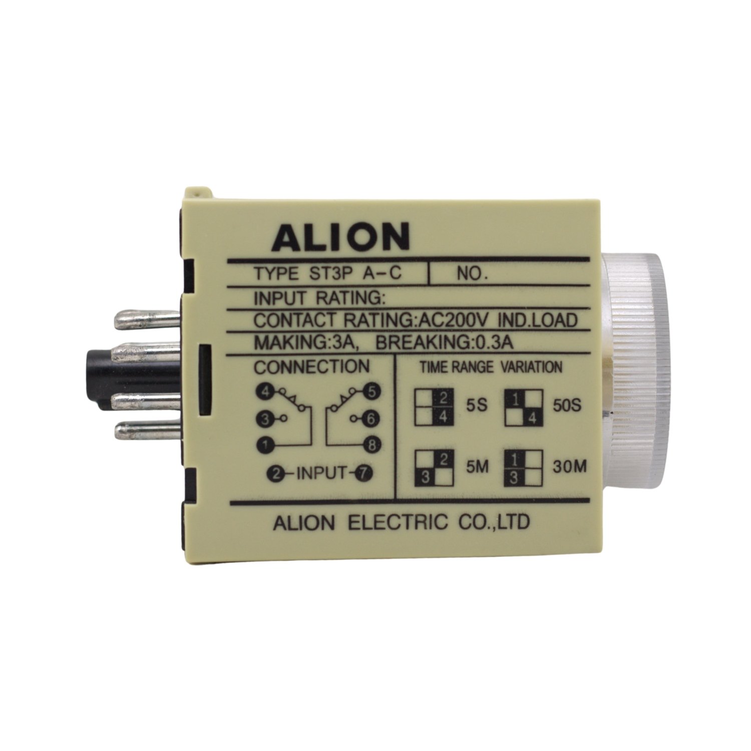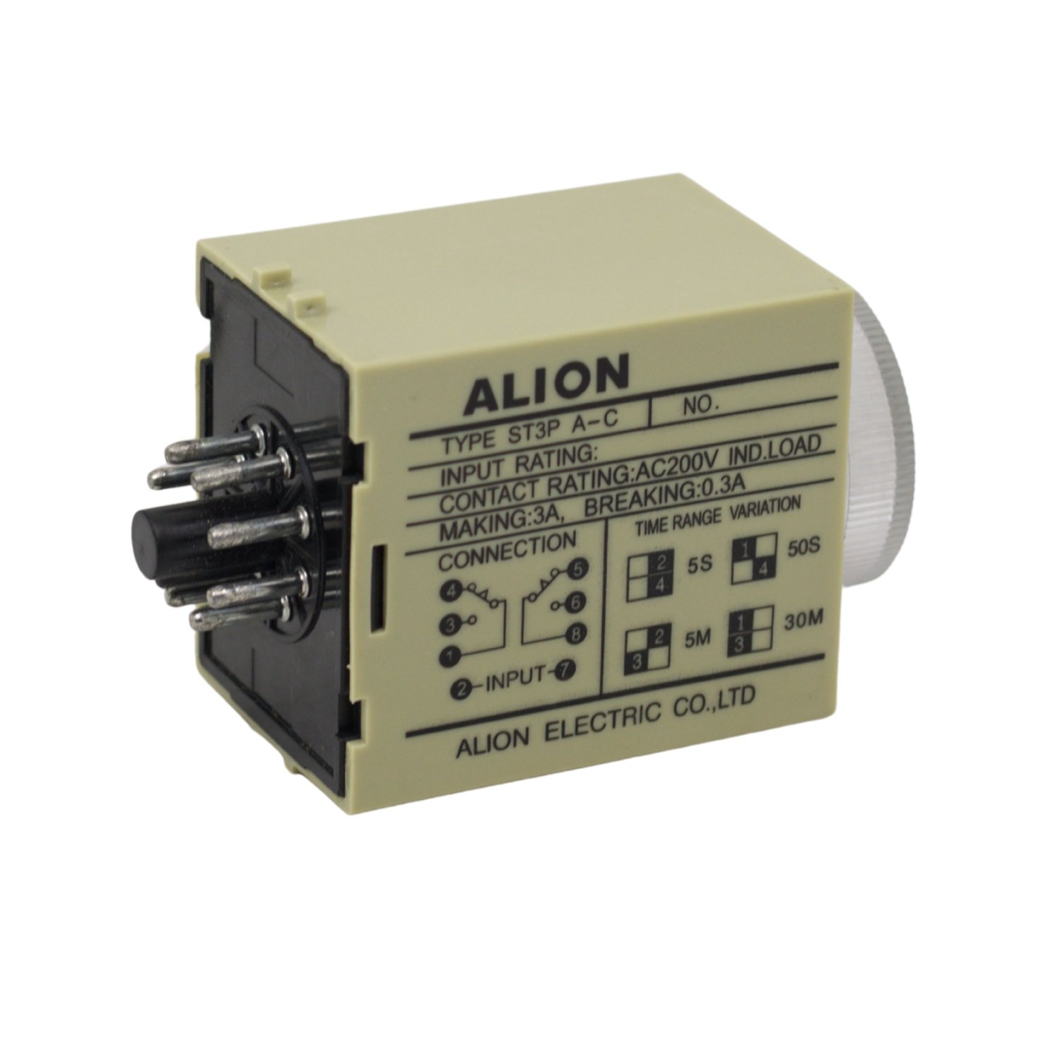 Relé temporizador de propósito general alimentado a 220V AC, con múltiples rangos seleccionables que van desde 0.5 segundos hasta 30 minutos.